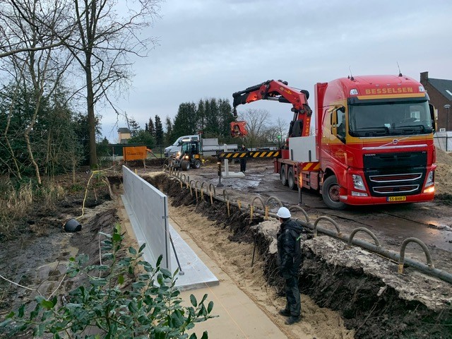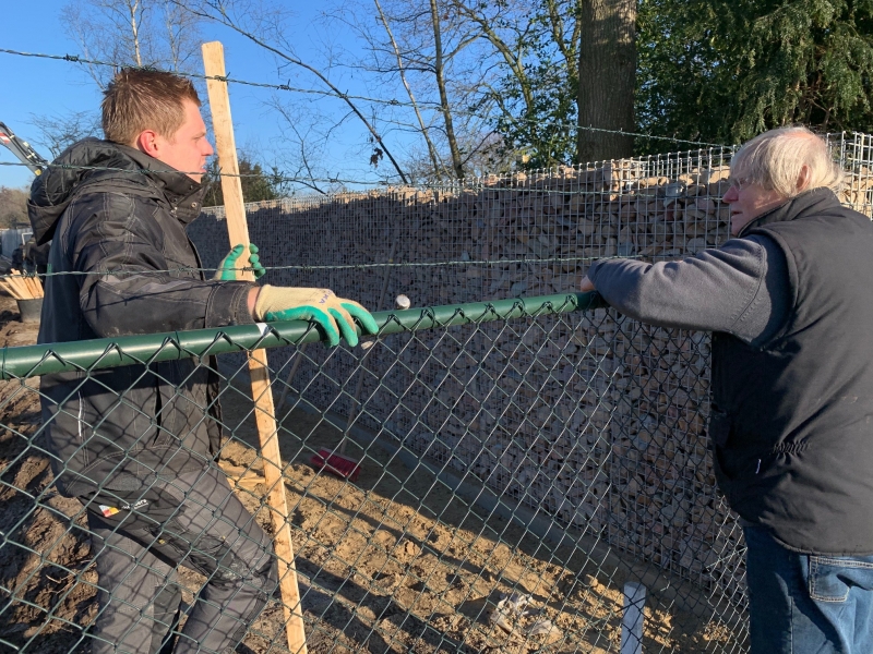 In De Schouw in Geffen zijn we bezig met het plaatsen van een schanskorfwand van Firmus Products, met een lengte van 65 meter en een hoogte van 2 meter. Er wordt een bouwplan gerealiseerd, genaamd Zes op Zuid, waarbij door onze opdrachtgever Peter de Lange is gekozen om deze robuuste afscheiding -gevuld met natuursteen- te laten plaatsen. Dit om meer privacy te creëren.